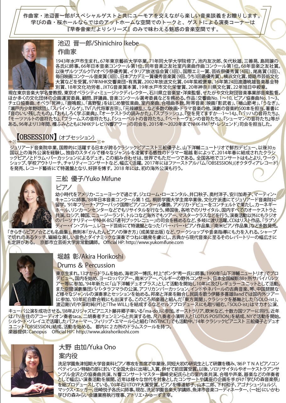 | 出演 | お話:池辺晋一郎 案内役:大野由加 OBSESSION 三舩優子 Yuko Mifune (piano) 堀越 彰 Akira Horikoshi (drums) |