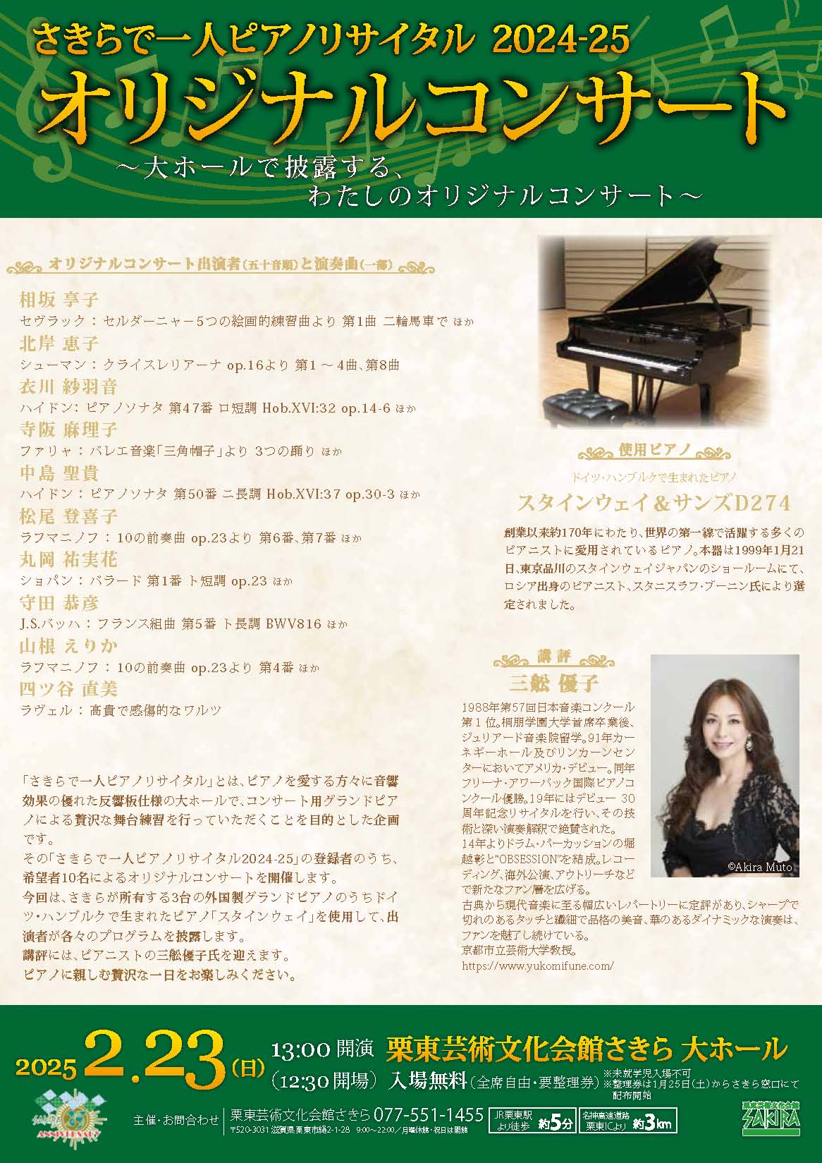 | 出演 | 「さきらで一人ピアノリサイタル2024-25」の登録者のうち、希望者10名 講評 三舩優子 |