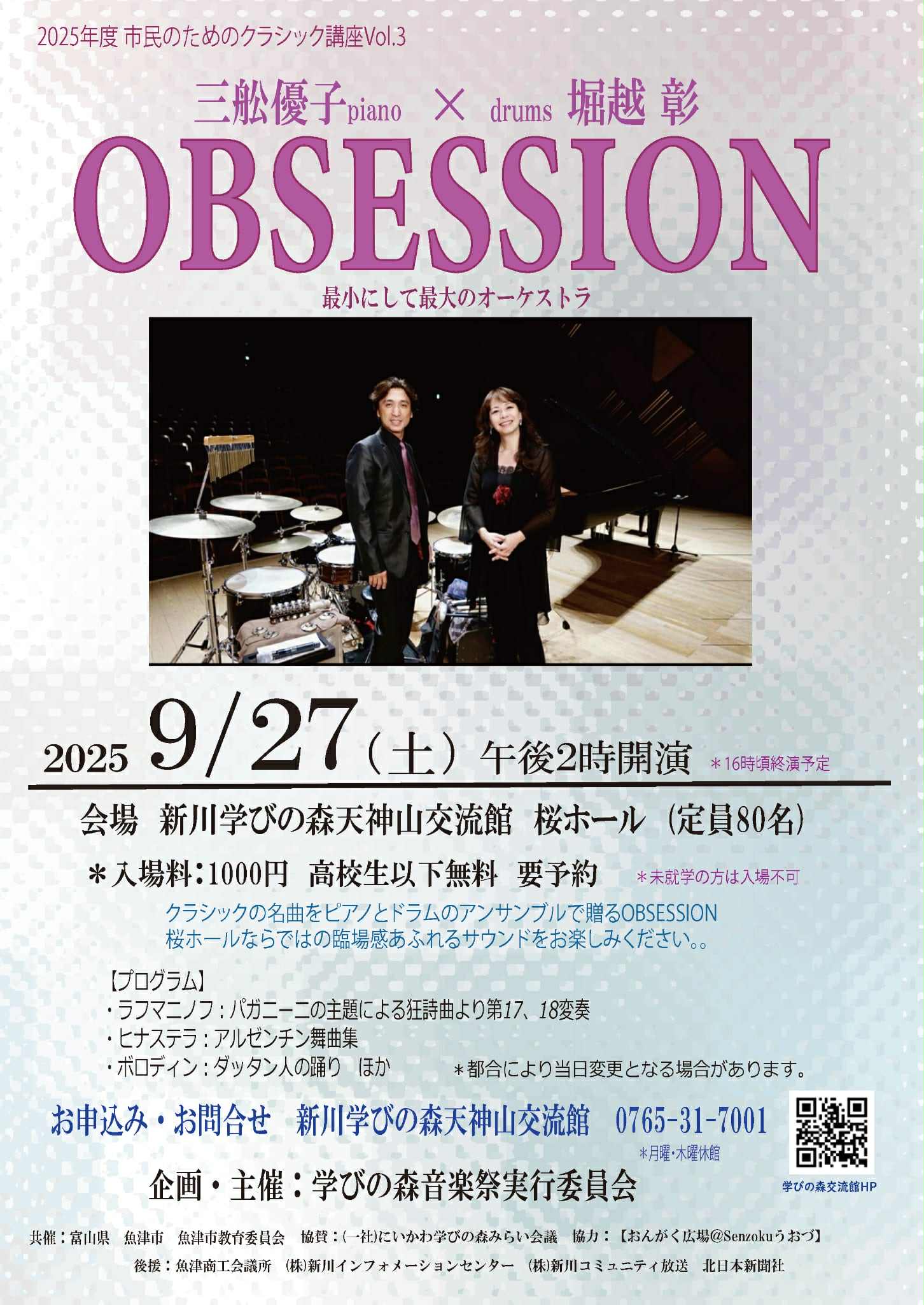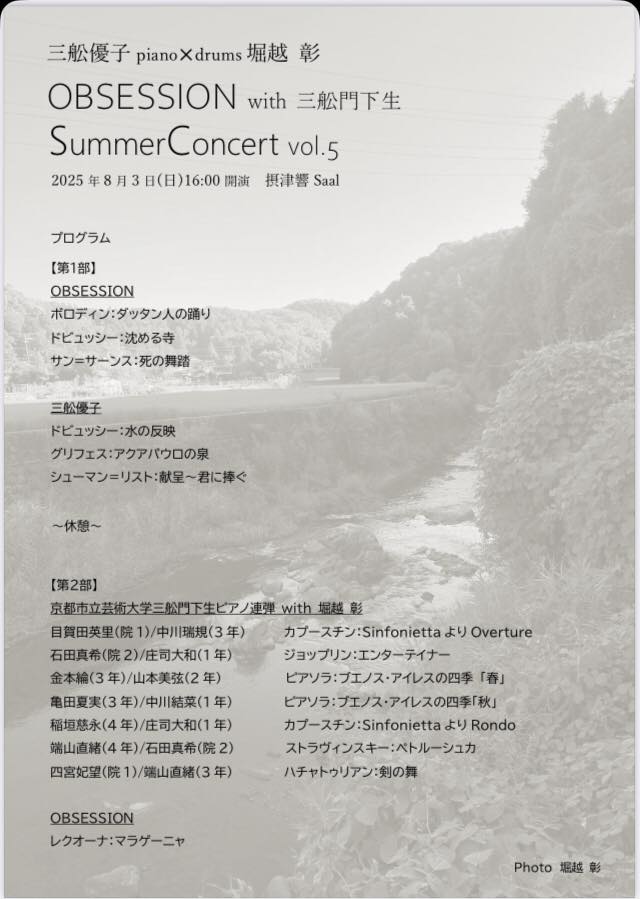 | 出演 | OBSESSION 三舩優子 (piano) 堀越 彰 (drums) 京都市立芸術大学 三舩優子門下生 石田真希(院2) 目賀田英里(院1) 四宮妃望(院1) 稲垣慈永(4年) 端山直緒(4年) 中川端規(3年) 亀田夏美(3年) 金本綸(3年) 山本美弦(2年) 中川結菜(1年) 庄司大和(1年) |