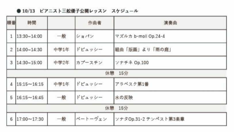 | 備考 | 三舩による公開レッスン受講生の方々は、小学生、音楽を志す生徒さん、趣味としてピアノを続ける成人の方まで多岐に渡ります。また三舩の指導をご観覧戴くことで、日頃の練習の進め方や音楽と向かい合う姿勢など、何かしらのヒントを必ず得られることと存じます。 |