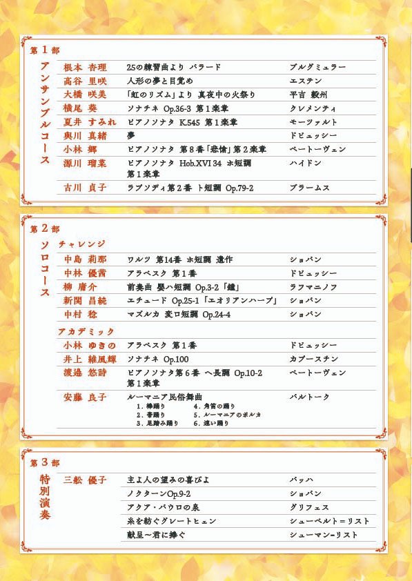 第1部 アンサンブルコース (9名) 第2部 ソロコース(チャレンジ5名、アカデミック4名) 第3部 特別演奏 三舩優子 J.S. バッハ:主よ人の望みの喜びよ ショパン:ノクターン Op.9-2 グリフェス:アクア・パウロの泉 シューベルト=リスト:糸を紡ぐグレートヒェン シューマン=リスト:献呈~君に捧ぐ |